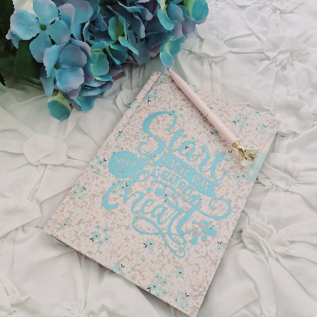 Cute floral journal and pastel pink diamond pen set, everything you need to get started.